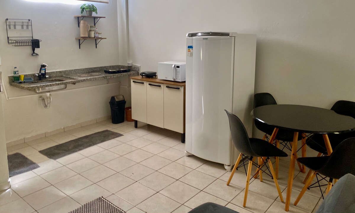 Studio Privativo e Individual com: - Wi-Fi - 1 Cama de casal com colchão com molas ensacadas + travesseiros com capa proteção anti-ácaro, 1 guarda roupa - 1 Ar-condicionado na sala - 1 espelho, 1 banco com almofadas, 1 TV - 1 Banheiro - 1 Bancada e 2 cadeiras - 1 Rede para descanso - Mini cozinha com: 1 Armário 1 Fogão elétrico 1 Geladeira 1 Micro-ondas 1 Filtro de água natural Utensílios domésticos essenciais Garagem para 1 (um) veículo, necessário informar no ato da reserva