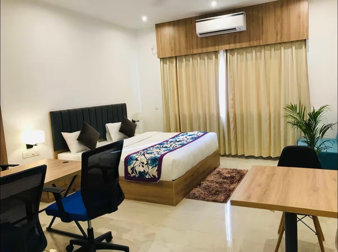 ◆Situated just 2 km from the scenic Fateh Sagar Lake. ◆Elegant 2-BHK apartment offering comfort and style. ◆Living room with an L-shaped sofa and cozy dining space. ◆First bedroom includes a private balcony with beautiful hill views. ◆Second bedroom features a convenient work desk. ◆Serviced by a top-tier 5-star hospitality team.