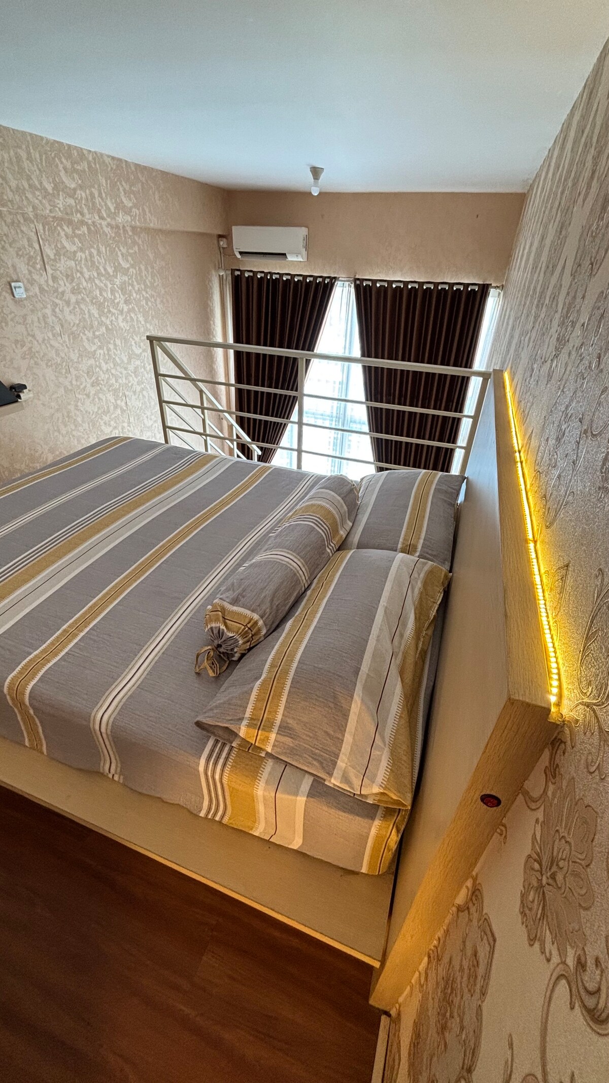 Stay in this cozy 2-bedroom, 1-bathroom apartment located on the 12th floor with stunning city views in the heart of Gresik, East Java. Perfect for long stays, the unit is fully furnished with AC, fridge, TV, and water heater for maximum comfort. Perfect for professionals or small families