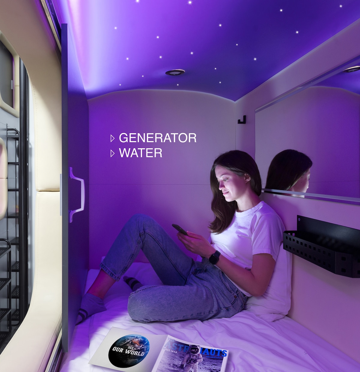 La sala cápsula es un espacio libre privado que te permitirá relajarte y sentirte cómodo. Colchón ortopédico, aire acondicionado, wifi, casillero para cosas están disponibles. El baño se ubica en el piso.
