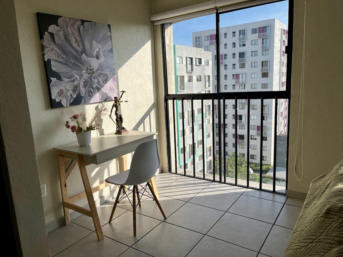 Dale a tus paseos, y a tus días, un punto de partida espectacular, en el que se conjugan diferentes estilos para brindar una experiencia única. Muebles rústicos, llenos de color, le dan vida a este moderno departamento. Su balcón es una joya. El departamento tipo estudio es un espacio abierto donde todas las actividades se intercomunican y sientes mucha amplitud, podrás disfrutar en todo momento del vínculo con la terraza que es a través de un ventanal muy grande que ofrece mucha iluminación al espacio interior y una vista espectacular a la ciudad, se convertirá en tu hogar y nuestro deseo más grande es que lo disfrutes al máximo, te esperamos!! En planta baja existe un Huerto Urbano donde puedes disfrutar de las múltiples variedades de plantas medicinales, comestibles y puedes realizar cosechas orgánicas para tu uso personal y enriquecer tu estancia. Te recomendamos que lo disfrutes ya que es un espacio muy lindo que fue diseñado con mucho cariño, nos encantaría que puedas vivirlo y gozarlo. Te esperamos!!! Para nosotros tu estancia y comodidad es lo más importante y estaremos atentos a cualquier necesidad que tengas para resolverla de inmediato, te esperamos con mucho gusto y disfruta de nuestro departamento que sin duda es tu mejor opción El departamento está ubicado en una zona tranquila, cultural y gastronómica, ideal para experimentar Guadalajara. Está a tres cuadras del Mercado Juárez o el Mercado México, y a 20 minutos caminando del centro histórico. Te recomendamos que puedas moverte y conocer la ciudad caminando, el departamento está perfectamente ubicado para experimentar Guadalajara, muy cerca del centro histórico, el paseo Chapultepec, en una zona tranquila, cultural y gastronómica. Muchos de los atractivos de nuestra hermosa ciudad podrás disfrutarlos sin necesitar gastar tu dinero con algún medio de transporte. La sensación de habitar el departamento es muy grata y acogedora cuando abres los ventanales y el espacio es uno solo integrado con la terraza lo disfrutarás mucho. Por la noche desde la terraza se observa a lo lejos el despegue de los aviones y es un espectáculo que lo puedes gozar. En la calle de libertad o en los alrededores del mercado Juarez (que de la terraza y volteando a la izquierda lo verás a 2 cuadras), podrás gozar de deliciosos desayunos en múltiples cafeterías, la gran mayoría tienen Terrazas con árboles y plantas, experimentaras momentos muy agradables y tranquilos.