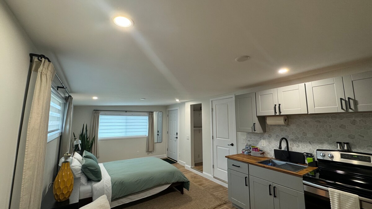 Este estudio recién remodelado tiene su entrada privada desde la parte trasera de la casa principal. Todos los sistemas eléctricos y de fontanería se reemplazaron y actualizaron para garantizar la seguridad de nuestros huéspedes y el uso de agua limpia. También hay un control de temperatura independiente de calefacción/aire acondicionado para este estudio que garantizaría la comodidad de nuestros huéspedes durante la estancia. Cama tamaño king con colchón de firmeza media. El sofá cama podría convertirse en una cama tamaño queen. Una cocina funcional completa que está muy limpia y tiene todos los electrodomésticos de acero inoxidable nuevos. El baño está equipado con accesorios de primera línea como Grohe y Toto que solo encontrarías en un hotel de lujo. También se proporcionan jabón básico, champú/acondicionador y detergente.