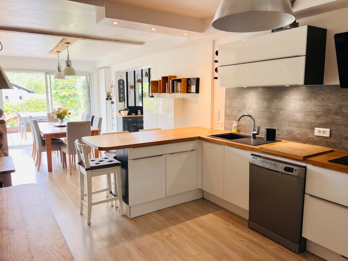 Preciosa villa vasca familiar en plena naturaleza, muy soleada al pie de las montañas. Muy buenas vistas despejadas, tranquilo en una propiedad con un bosque. A 5 minutos de las playas, golf, tren de la Rhuna, bentas de Ibardin, todas las comodidades. Muy fácil de llegar.En plena naturaleza y, sin embargo, tan cerca del centro: ¡un lujo! Cuenta con fibra, lo que permite el teletrabajo si es necesario.
