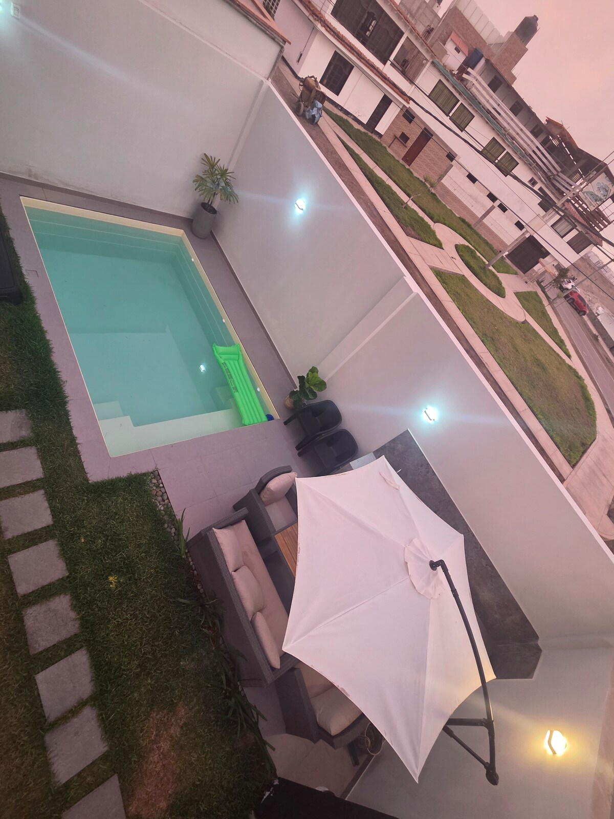 Hermosa casa de playa equipada y amplia con 300 m2 de terreno, tiene: -4 habitaciones amplias con baño privado cada una -Patio amplio con cancha de frontón -Piscina con catarata y luces -Zona de Parrilla -1 terraza con vista a la piscina y zona de parrilla -1 terraza en el tercer piso con vista al mar -1 mini gimnasio en el cuarto principal -2 Televisores grandes -Juegos de mesa -2 Fulbitos y 1 Sapo -Cocina equipada y lavandería -Estacionamiento interno y externo para varios vehículos