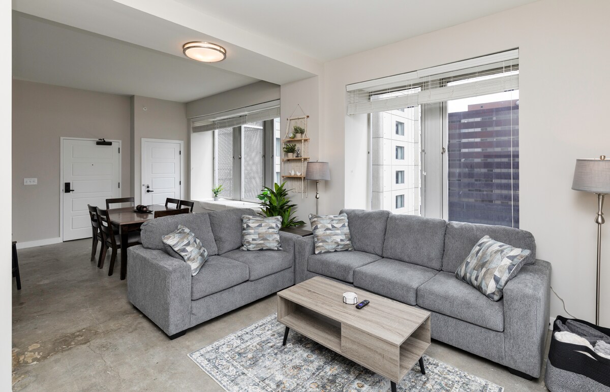 Apartamento en el centro de la ciudad en el corazón del centro de Des Moines, disfruta de la unidad de esquina de la planta superior con vistas a la ciudad e increíbles vistas al atardecer. A 10-15 minutos a pie del centro cívico de Iowa/Wells Fargo Arena. A 7 minutos a pie de Court Avenue (donde están la mayoría de los bares) y a 10-15 minutos a pie del East Village. A 3 minutos a pie de Starbucks. Además, el edificio está convenientemente conectado con el sistema de pasos elevados y enfrente del garaje cubierto.