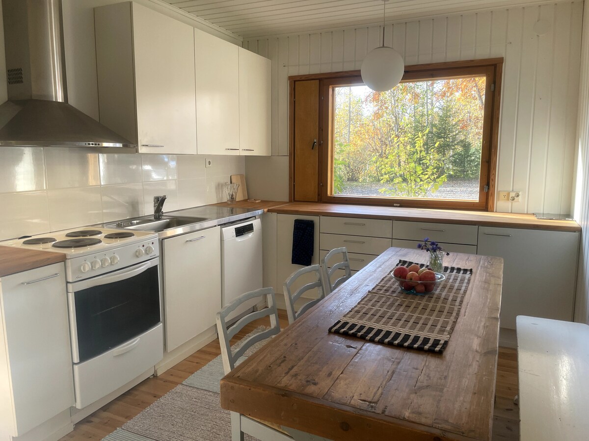 Casa nueva cerca del lago. Lugar tranquilo. A 25 minutos de Oulu. Parada de autobús a 500 m. Cocina, salón, 2 dormitorios, sauna, baño. Posibilidad de esquiar o caminar en el lago o el bosque. Máximo 4 personas. Jacuzzi +50e/día (límite -20c). Mínimo 2 días. Se puede recoger en Oulu o Kiiminki. 4 juegos de esquís de fondo y raquetas de nieve de uso gratuito. Puedo organizar trineos de husky, caza de Aurora y otras actividades de invierno. Ei juhlia, máx. 4 vierasta. Oulu a 25 min Rovaniemi 2,5 h