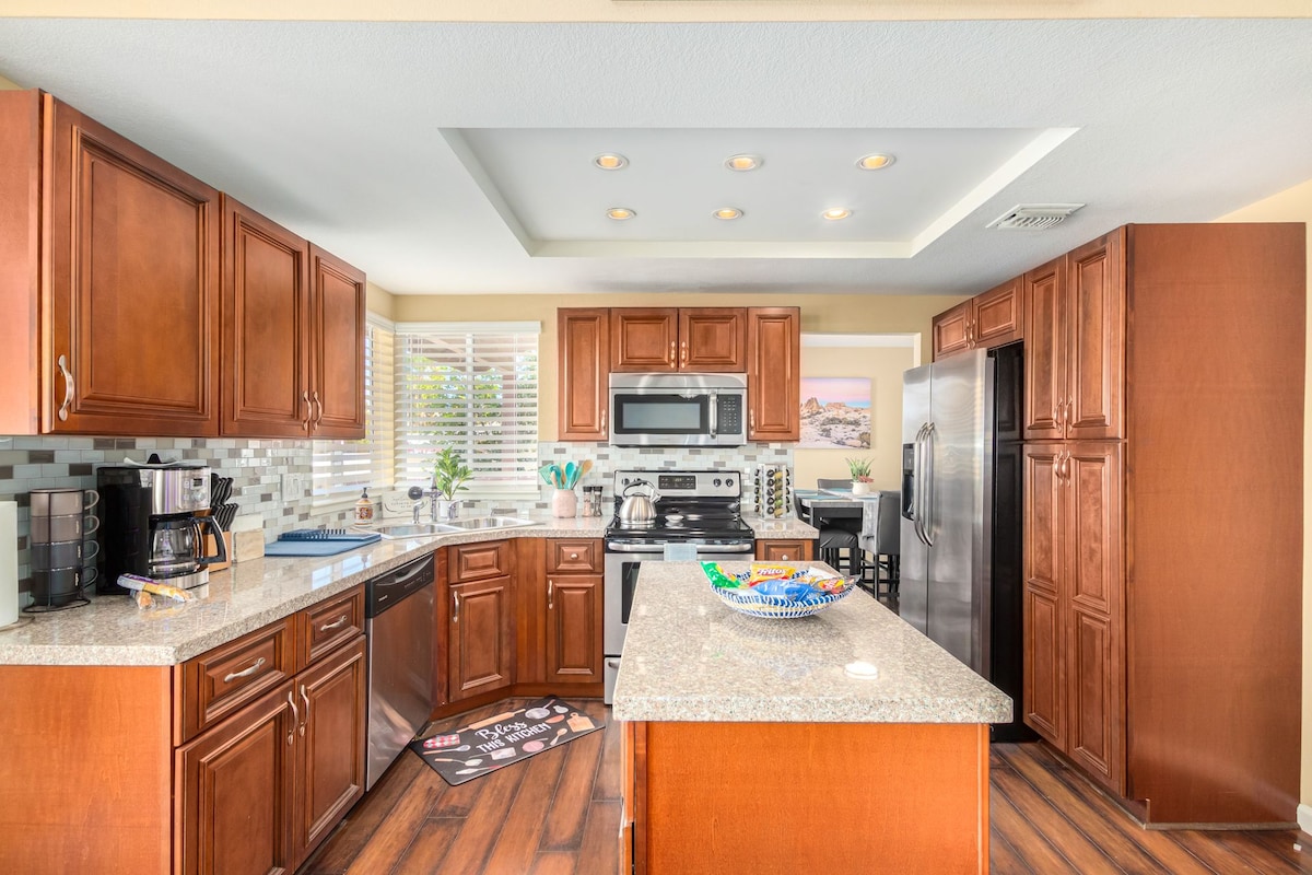 Relájate y aléjate de la ajetreada vida de la ciudad y disfruta de una casa llena de entretenimiento donde se te da la bienvenida con una mesa de billar y una zona de bar al entrar. También se incluyen lo siguiente: chimenea, bañera de hidromasaje, jacuzzi, zona de cocina con barbacoa exterior, una zona de televisión exterior y wifi. Puedes disfrutar de este espacioso alojamiento de 3 dormitorios y 2 baños con toda la familia. Uno de los dormitorios incluye incluso un área de trabajo. Cancha de baloncesto, parque y zona de picnic comunitarios del barrio. Tucson está a solo 20 minutos en coche.