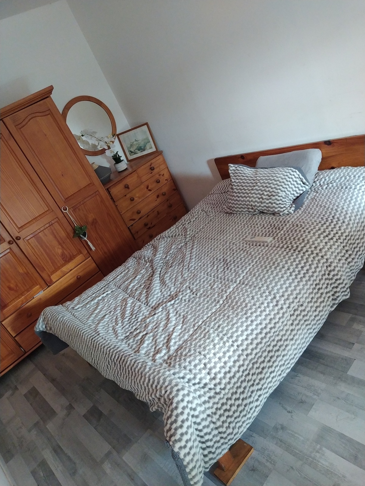 Madre que vive con mis 2 hijos y un perro pequeño muy agradable, alquilo una habitación de 9 m2. La habitación consta de una cama convertible para 1 o 2 personas, un escritorio y una estantería. Tendrá acceso al baño, la cocina, la sala de estar y el jardín. Se proporcionan sábanas y toallas. Hay té y café a su disposición. Mi casa se encuentra en una urbanización cerrada, a 5 minutos andando de la parada de autobús en el centro de la ciudad.