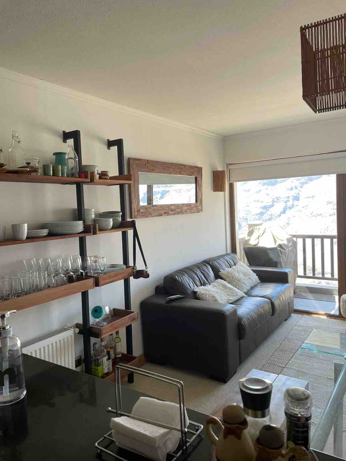 Great apartment in the heart of Valle Nevado!! Daily room service included. 1 double bed bedroom + walking closet; 1 Bathroom; well equipped open kitchen; living room with a sofa bed suitable for 2 adults; and a small balcony. Walking distance from ski slopes, restaurants, shops and mini market. Departamento casi nuevo y muy cómodo, en pleno Valle Nevado!! Servicio de limpieza diario. Del edificio uno sale caminando a las pistas, los restaurants y tiendas de Valle!