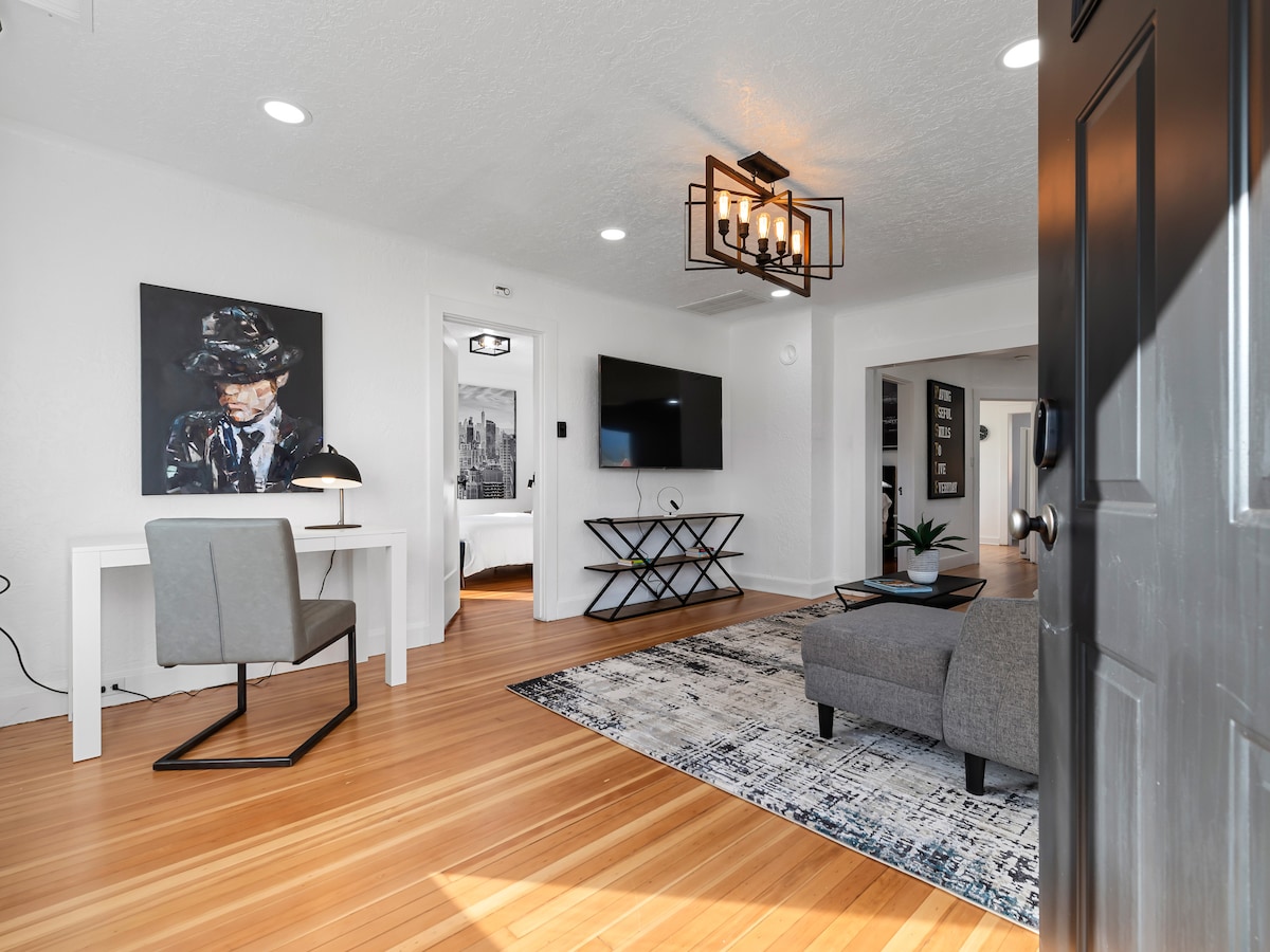 Disfruta de una experiencia de lujo en este céntrico alojamiento. Con acceso rápido a las principales autopistas, las opciones para explorar al aire libre, restaurantes, conciertos y bailar son ilimitadas. Disfruta de la acogedora cama tamaño queen o utiliza la televisión para iniciar sesión en tus servicios de streaming y relájate en el cómodo sofá para ver una película. La cocina pequeña tiene nevera, congelador, placa eléctrica, horno tostador/freidora de aire, platos y utensilios de cocina.
