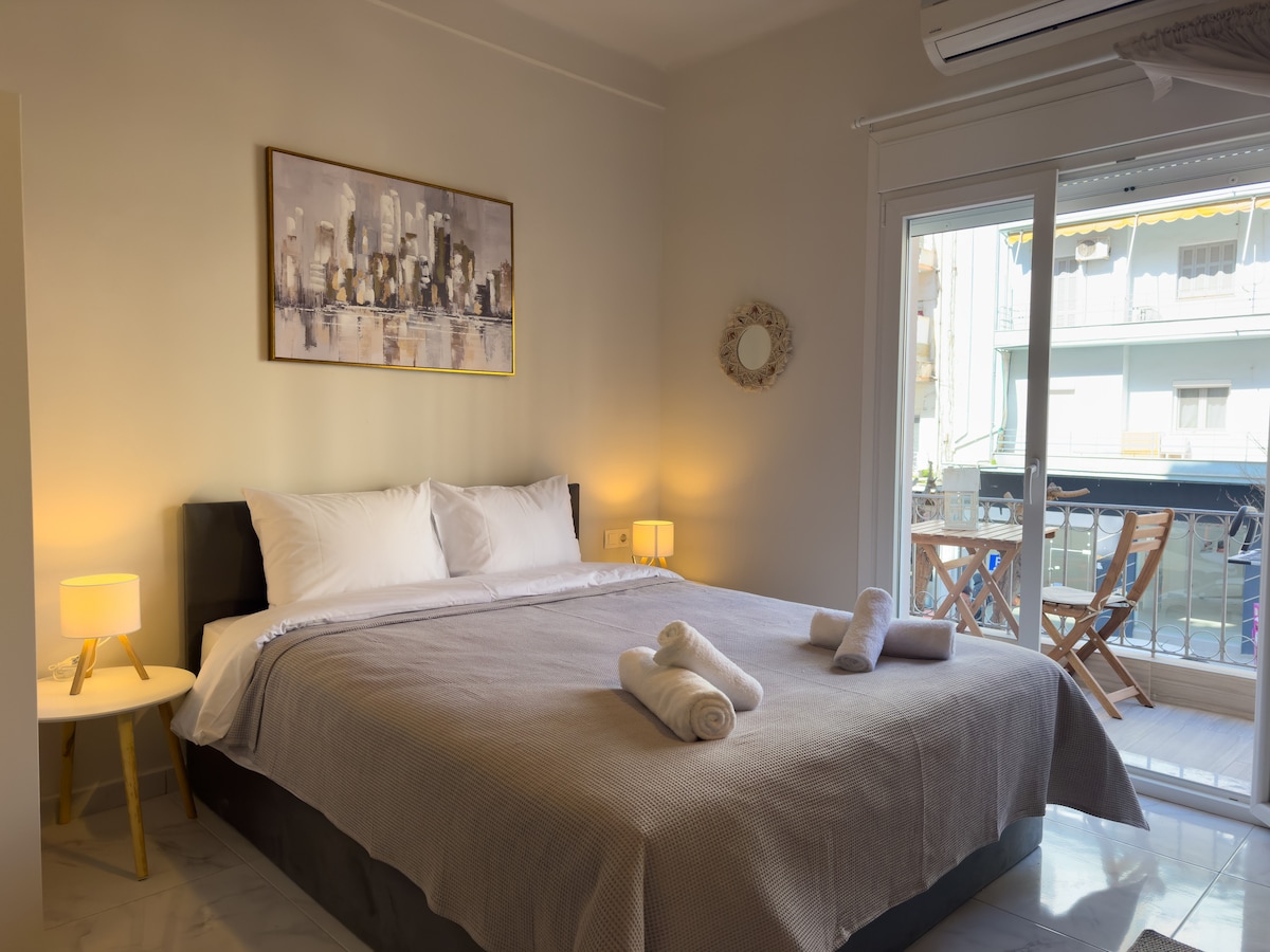 Elegantly refurbished with every detail crafted for your comfort Step into a spacious walk-in rain shower with premium cosmetic products and sleep deeply in a Luxury king-size bed (1.80×2.00) Feel like home with fully equipped kitchen, ergonomic working space or glow up corner. Enjoy highest comfort while the city’s heart and sea promenade is in walking distance Write us now a message for your perfect stay in Thessaloniki - Estia Premium Apartments
