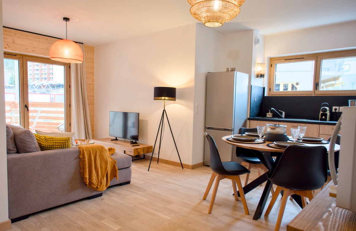 Disfruta de una ubicación ideal, con fácil acceso a las pistas. El apartamento es nuevo, amplio, luminoso y moderno, con 2 terrazas. Relájese en un entorno elegante y cálido. ¡Una estancia que combina comodidad, estilo y magia de la montaña! IMPORTANTE: el apartamento está situado frente a residencias en construcción, las obras se detienen durante el invierno, lo que garantiza la ausencia de ruidos molestos. Aunque la vista está parcialmente enmascarada, se puede disfrutar de las terrazas
