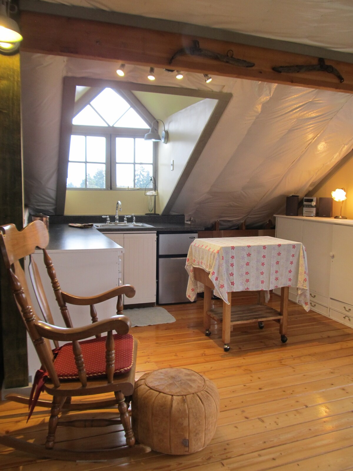 From Vashon Island take a passenger ferry directly to pier 50 and Seattle’s famous waterfront. Walk 15 minutes to Pike Place Market, Aquarium or World Cup stadiums! Bright, lush and very spacious barn loft studio & small bedroom. New solar panels- see photo. We are now carbon-neutral! Enjoy territorial views of pastures & garden. Queen bed w/memory foam topper, double futon couch in separate small bedroom. Kitchenette, dining table, luxurious couches. Come relax!