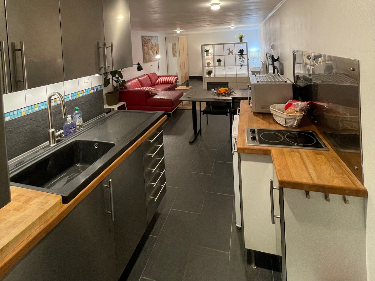 ESTUDIO de 25 m² y altillo de 10 m² situados en la parte delantera de nuestra casa. Consta de una gran habitación con cocina americana, mesa de comedor y sofá cama de 2 plazas. Ducha italiana, WC. Un altillo con cama doble. Este estudio está equipado con: secador de pelo, plancha/tabla de planchar, nevera, microondas, horno, hervidor de agua, cafetera Nespresso, tostadora y TV con Swisscom-Box y WIFI. Plaza de aparcamiento. Posibilidad de reducir las bicicletas en un local cerrado.
