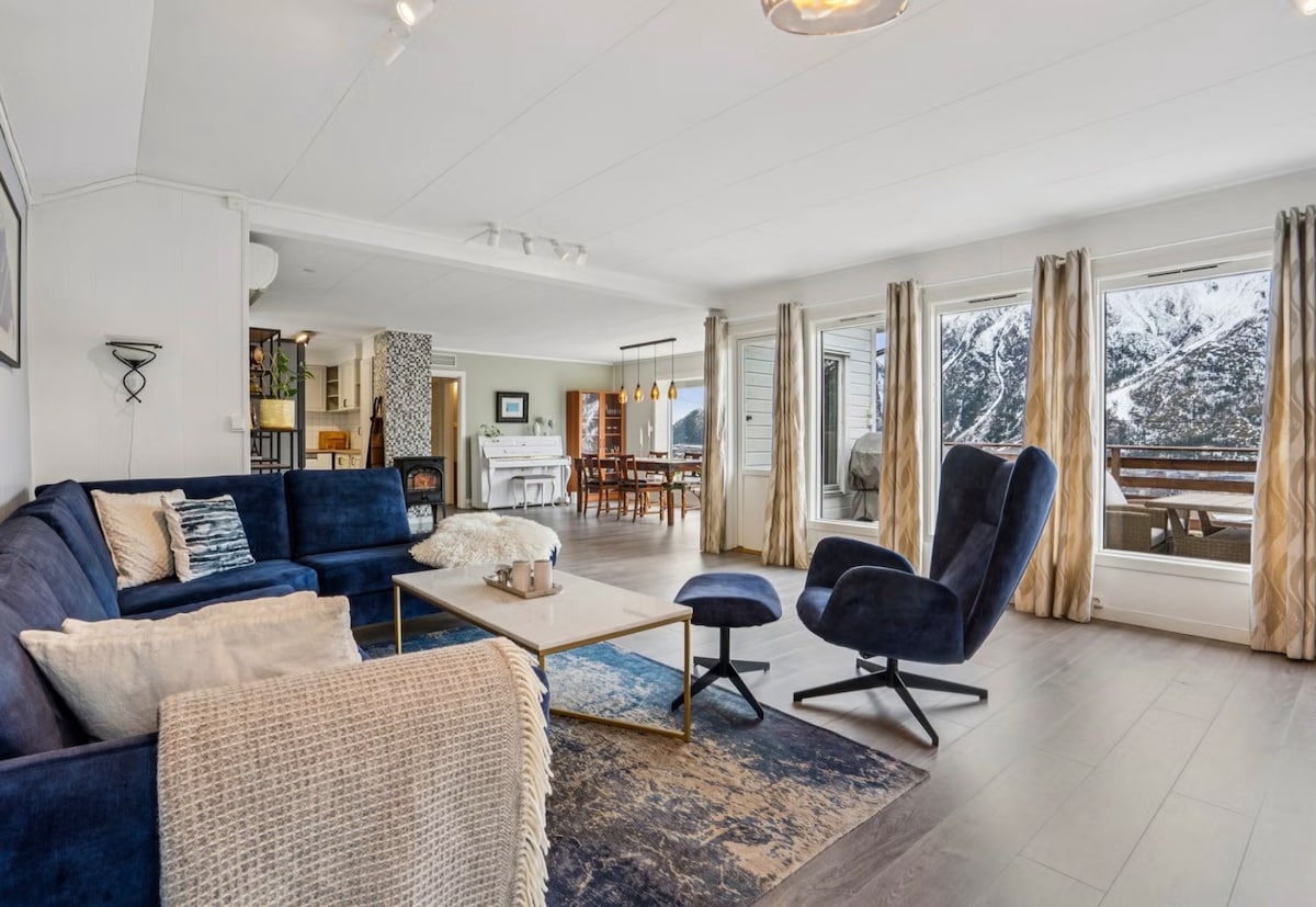 Fargerikt hus der mange kan trives. 3 minutters gange fra Mosjøen stasjon, kort veg til det meste. Åpen kjøkken- og stueløsning, spiseplass for 12, to bad(ett med vaskemaskin og tørketrommel) og masse uteplass. 5 soverom, med dobbeltseng eller senger som kan omgjøres til to soveplasser. Bålpanne som stemningsfullt kan fyres i hagen eller grill kan brukes til et deilig måltid på verandaen. Trampoline og huskestativ i hagen. Bod med mulighet for sykkelparkering. Utvask tar dere selv.