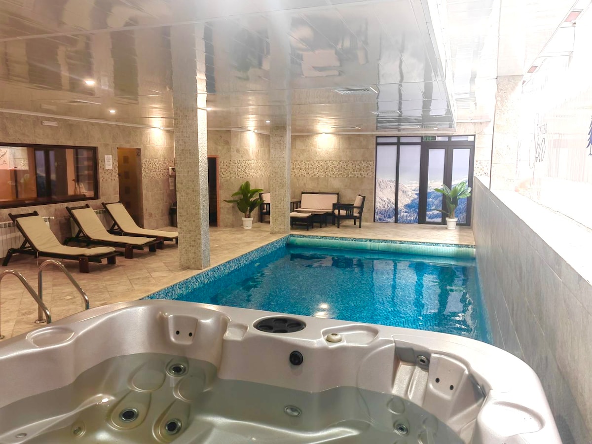 Le presentamos un estudio no estándar para sus inolvidables y románticas vacaciones en «The House». Dormitorio con baño y vista🏔 ☀. La bañera está situada en el centro con vistas al amanecer, la luna y la montaña. La zona térmica se puede utilizar de forma gratuita de 10:30 a 18:30. Los huéspedes tienen wifi gratuito, NETFLIX y TV por cable con canales premium. La cocina está equipada con utensilios, vasos, nevera, cafetera y café.