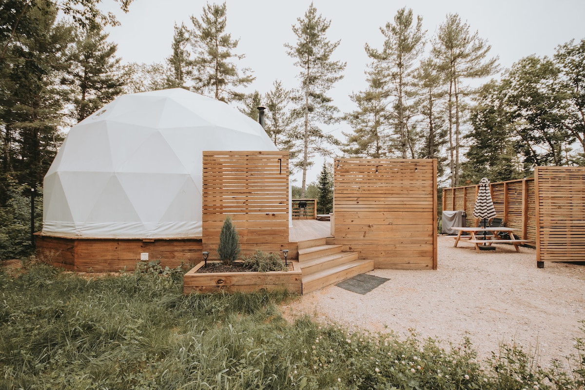 Located just over an hour from Ottawa, Ontario. This luxury geodesic dome is fully equipped with a hot tub, AC, electric heating, kitchenette with cook top, couch, wood stove and full bathroom to make your stay comfortable year-round. Sleeping arrangements include a queen bed on the main level (murphy bed) and a king bed on the loft. 5 minutes from an SAQ, fuel, light groceries, restaurant and bar. Our domes are also located directly along the official ATV and snowmobile trails.