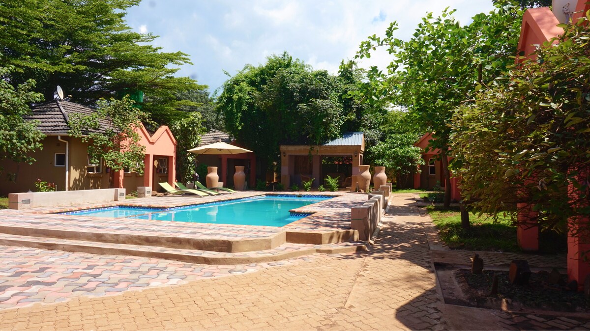 Te encantará este adorable lugar para hospedarte. Somos un tranquilo albergue de 24 habitaciones, regentado por sus propietarios, situado en el corazón de Victoria Falls, que ofrece una ubicación céntrica privilegiada cerca del centro de la ciudad. Nuestras habitaciones están diseñadas para ofrecer un confort moderno con encanto africano, con exuberantes jardines y un ambiente sereno para una estancia tranquila. Nuestra oferta única incluye dos piscinas infantiles, un delicioso restaurante con modernos platos de fusión afro y un pub con vistas a la zona de la piscina.