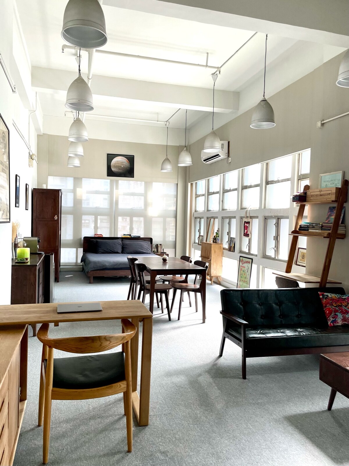 Disfruta de una experiencia elegante en este espacio comercial de estilo loft convertido con una cama tamaño king, luz natural, espacio de trabajo, diseño moderno, wifi rápido y estable, lavadora/secadora, equipo de ejercicio, bicicleta plegable, amplio espacio de almacenamiento, TV con Netflix y Playstation, Roomba y una azotea. El apartamento está a 5 pisos a pie, a 1 minuto a pie de la estación de metro de Sheung Wan. La ubicación es muy práctica. La cocina americana es básica con inducción, horno tostador, vaporera, utensilios, etc.
