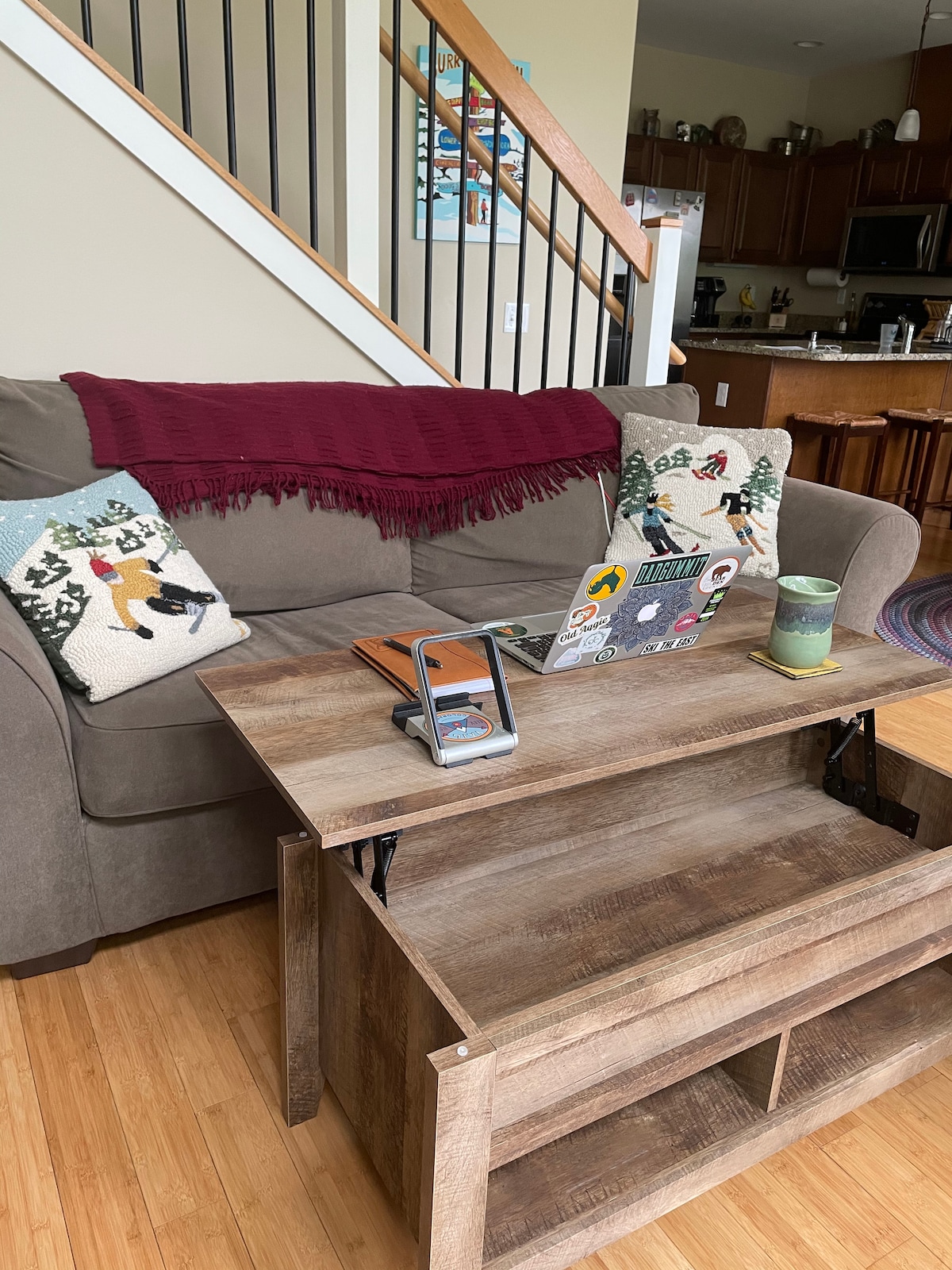 Our condo sports everything you will need for your stay. We have one bedroom with a queen bed, and two twin pull out couch beds in the living area. Full kitchen, laundry, dining area, porch with dining table and chairs, and an electric BBQ grill. Condo has direct Kingdom trail access on site, bike storage is ok inside or on porch. There is some summer siding work going on, the crew is very good but be aware work commencing. Enjoy your stay!!