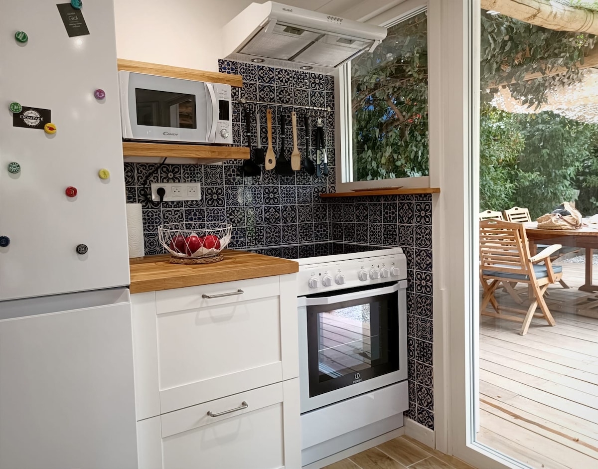 Encantadora caravana tipo gitana con zona de jacuzzi (con suplemento fuera de julio agosto*). Ideal para dos personas, pero posibilidad de alojar a dos niños menores de 12 años debajo de la cama principal**: - 2 camas de 140x190 - 1 cuna bajo petición * Fuera de julio y agosto, suplemento en el lugar de 20€ por agua y calefacción del jacuzzi ** suplemento en el lugar de 20€ por persona adicional más allá de 2.