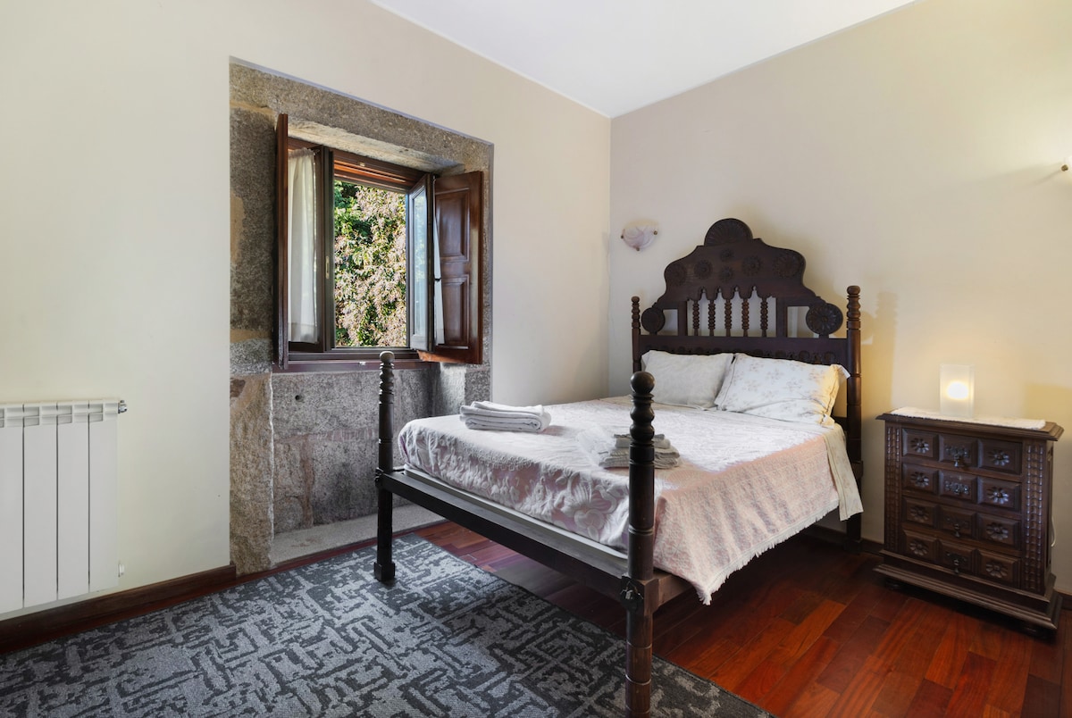 Disfruta de la serenidad, el ambiente tranquilo del pueblo y despierta con el canto de los pajaritos. Crespos se encuentra a 8 km de Braga, y a 4 de Amares, entre lo urbano y lo rural, una unión perfecta. Tiene una piscina privada, sin cloro, con tratamiento natural de sal, agua clara y con una temperatura muy agradable. El jardín es colorido y fresco. Puedes cenar al aire libre, en la terraza o en el jardín, junto a la piscina. Eres muy bienvenido a esta hermosa casa de pajaritos.