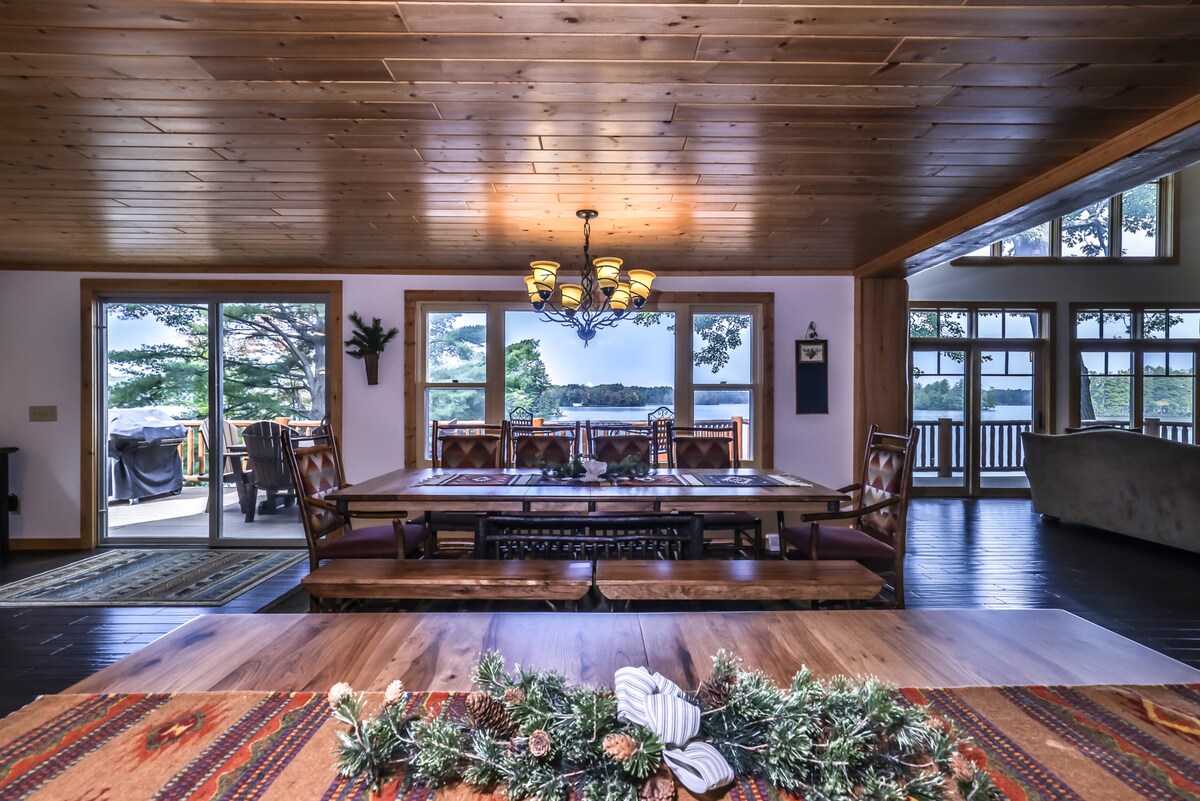 ¡Luxury Northwoods Lodge perfecto para grupos con tres dormitorios tamaño king, cuatro alcobas tamaño queen, un futón tamaño queen y un sofá cama doble seguramente proporcionará una gran experiencia en Northwoods! Nuestras comodidades incluyen jacuzzi al aire libre, gran terraza junto al lago con televisión al aire libre y chimenea de gas, bar personalizado y sala de juegos, suave pendiente al lago de fondo de arena, kayaks, tabla de paddle, bote de remos, muelle privado, juego de lanzamiento de bolsas personalizado, parrillas Weber y Blackstone, la cocina está totalmente equipada para satisfacer todas tus necesidades.
