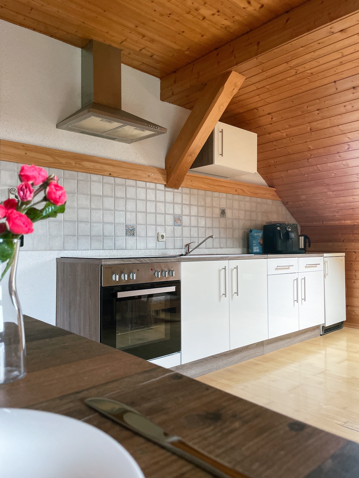 Ofrecemos una casa de madera muy especial con sauna de barril justo a las puertas de Algovia. Con una ubicación céntrica para hacer numerosas excursiones o simplemente pasar unos días agradables en una casa construida y amueblada de forma sostenible. ¡No se dejará ningún deseo por cumplir! Cocina Bulthaup totalmente equipada, con una gran mesa de roble macizo en el centro. En la terraza, una barbacoa de carbón espera a ser encendida y, en el gran jardín, la cama elástica y la chimenea hacen que los corazones latan más rápido.