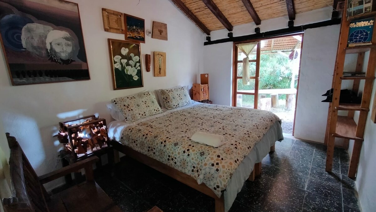 Acogedora cabaña para parejas y familias, muy cerca del pueblo histórico de Villa de Leyva (1 km) y a la vez en medio de un paraíso campestre único. Nuestros huéspedes pueden disfrutar de amplios jardines, lago y preciosos senderos naturales. La cabaña tiene tres maravillosas habitaciones, 3 baños, sala-comedor, cocina moderna que se abre a un porche absolutamente espectacular. La cabaña está alejada de la casa principal de mi familia, tiene excelente privacidad, y también gran seguridad!!