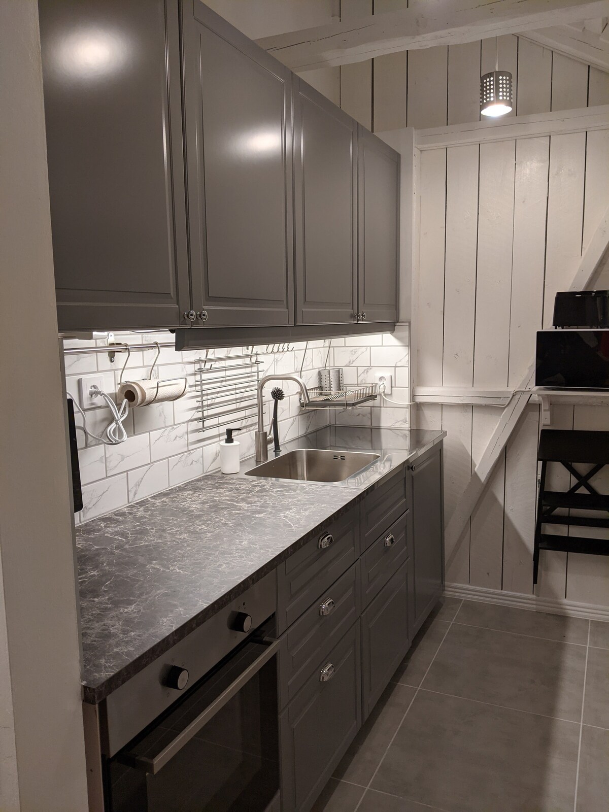 Encantadora cabaña pequeña recientemente renovada con altos estándares. A 1200 m de la estación de tren y a 300 m de una zona verde con circuito de ejercicio. El dormitorio tiene aire acondicionado, una cama de 140 cm, TV y wifi. Cocina totalmente equipada con inducción, microondas, horno y calefacción por suelo radiante. El baño tiene lavadora con secadora incorporada, inodoro, lavabo, ducha y calefacción por suelo radiante. La casa está libre de animales y de humo.