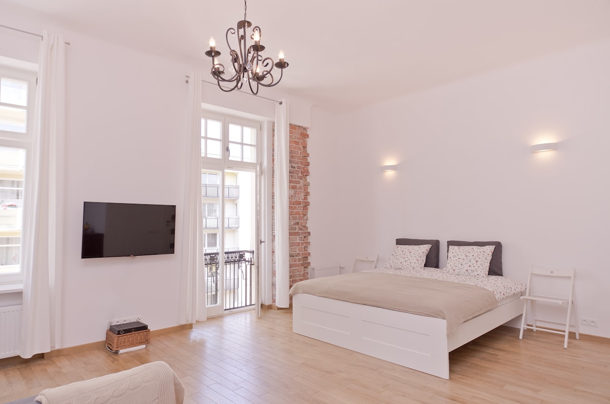 A beautiful roomy studio in the Old Town This studio is in a pleasant neighborhood with pubs and restaurants nearby, and only 150 meters to the Royal Route. Fully renovated in 2013, our studio comfortably accommodates up to 2-4 travelers (one king size double bed and additional pull-out sofa). Fully equipped kitchen ncluding coffee machine, teakettle, and utensils for basic cooking. We also provide maps, guidebooks and other materials to help you get your bearings in Warsaw. Wi-Fi, Apple TV and NETFLIX Hope to see you in Warsaw!
