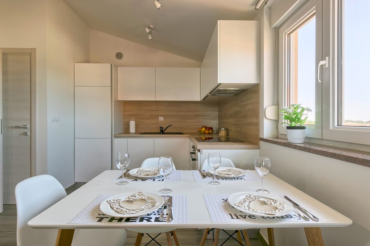 Nuevo departamento moderno ubicado en un pequeño lugar tranquilo junto al mar. Se ubica en el primer piso de una casa con terraza y una hermosa puesta de sol y vistas al mar. Tiene un patio vallado de 500 m2 con espacio de estacionamiento. El anfitrión se dedica a la producción y venta de aceite de oliva y vino nacionales, y la venta de verduras.El apartamento está ubicado a solo 10 minutos a pie de la playa más cercana,y el lugar ofrece un puñado de playas naturalmente vírgenes que son de fácil acceso