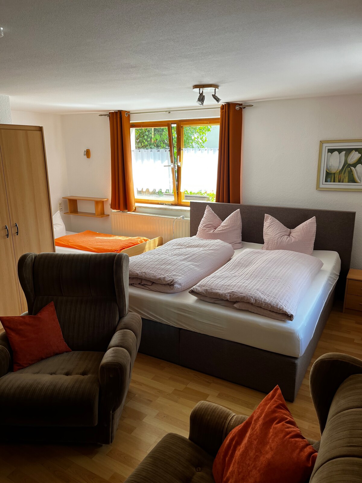 Tenemos varias habitaciones disponibles para ti, todas bien amuebladas y bien equipadas: Aquí te ofrecemos una habitación triple. En todas las habitaciones encontrarás un inodoro y una ducha separados, así como TV vía satélite. Todos los precios incluyen IVA. Somos flexibles con el alquiler, tratamos de cumplir tus deseos, hablamos con nosotros. Te invitamos a reservar el desayuno. Desayuno € 7.00/p.p. Perro € 10,00/p.T.