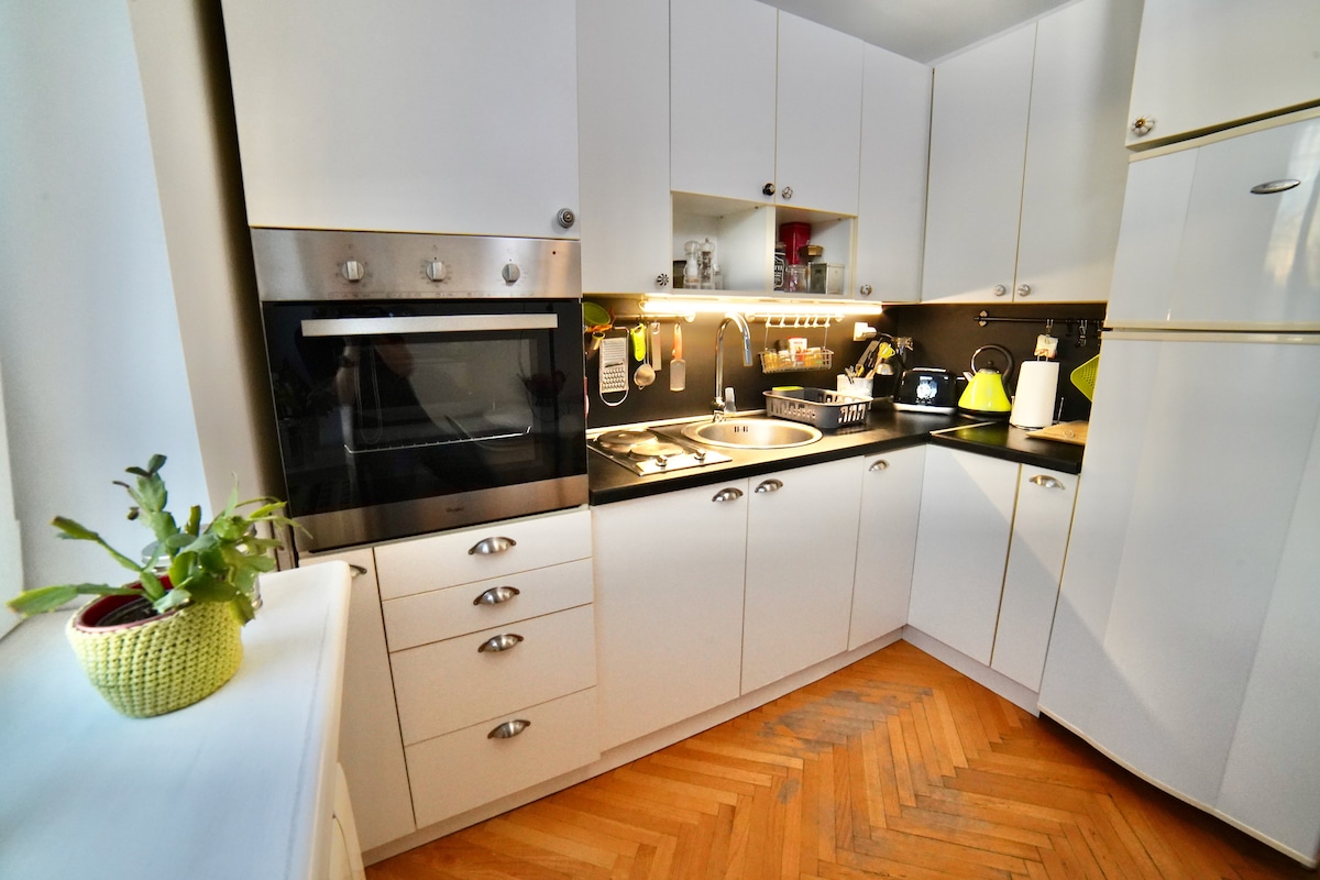 Nuestra casa es uno de los apartamentos de 2 dormitorios más bonitos del centro de Belgrado. Atrae elogios unánimes de visitantes y diseñadores. El apartamento está justo enfrente de la calle Kosancicev venac, y en la entrada de la zona peatonal que conduce al corazón de Belgrado: la calle Knez Mihajlova. Está en la octava y última planta de un edificio de hormigón de estilo moderno de mediados del siglo XX, que disfruta de una exultante abundancia de luz natural y ofrece unas vistas impresionantes de la ciudad.