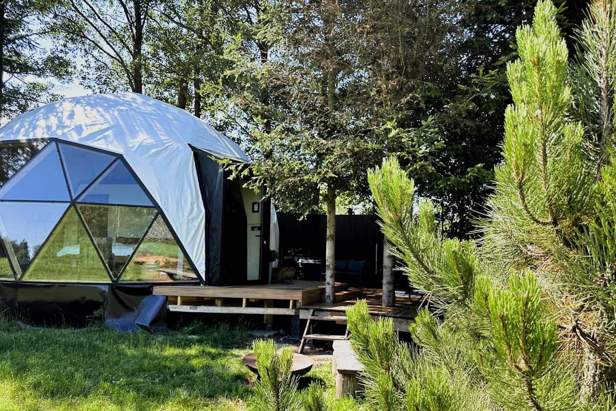 Glamping dome with outdoor hot tub and sauna
