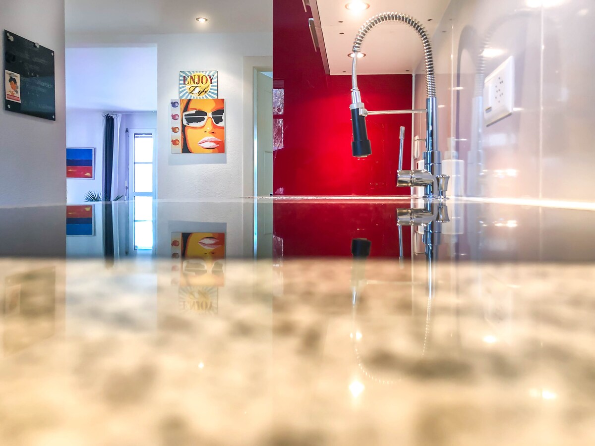Habitación con terraza amplia. Cocina: cocina totalmente equipada con lavavajillas, placa de cocción, microondas, horno y cafetera. Las bebidas se proporcionan de forma gratuita. -Sala de estar: sofá cama. Wifi gratuito, gran Smart TV -Cuarto de baño: espacioso inodoro con ducha y espejo grande. -Iluminación: iluminación LED ambiental La habitación te ofrece la combinación perfecta de confort y relajación con un estilo propio. Ideal para parejas (+ niño), personas que viajan solas o viajeros de negocios