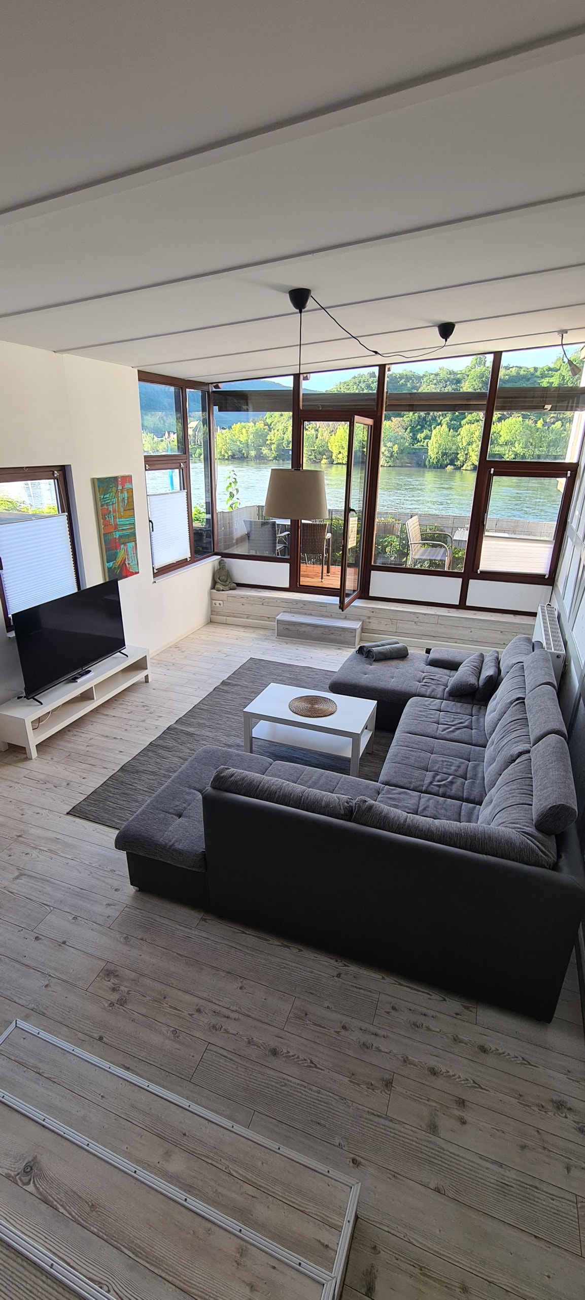 Die FeWo befindet sich in einem freistehenden Einfamilienhaus mit Einliegerwohnung in Höhenlage von Lahnstein. Das 1.500 qm große Hanggrundstück bietet einen atemberaubenden Blick auf das Rheintal und Schloss Stolzenfels. Trotz ruhiger Lage sind es bis zum Zentrum von Lahnstein nur 900 m Fußweg, die Bushaltestellen sind in nur 2 Gehminuten zu erreichen. Insgesamt stehen 105 m² Wohnfläche zur Verfügung (2 Schlafzimmer, Wohn-/Esszimmer, Küche, Bad, separates WC, Flur, Wirtschaftsraum, Terrasse).