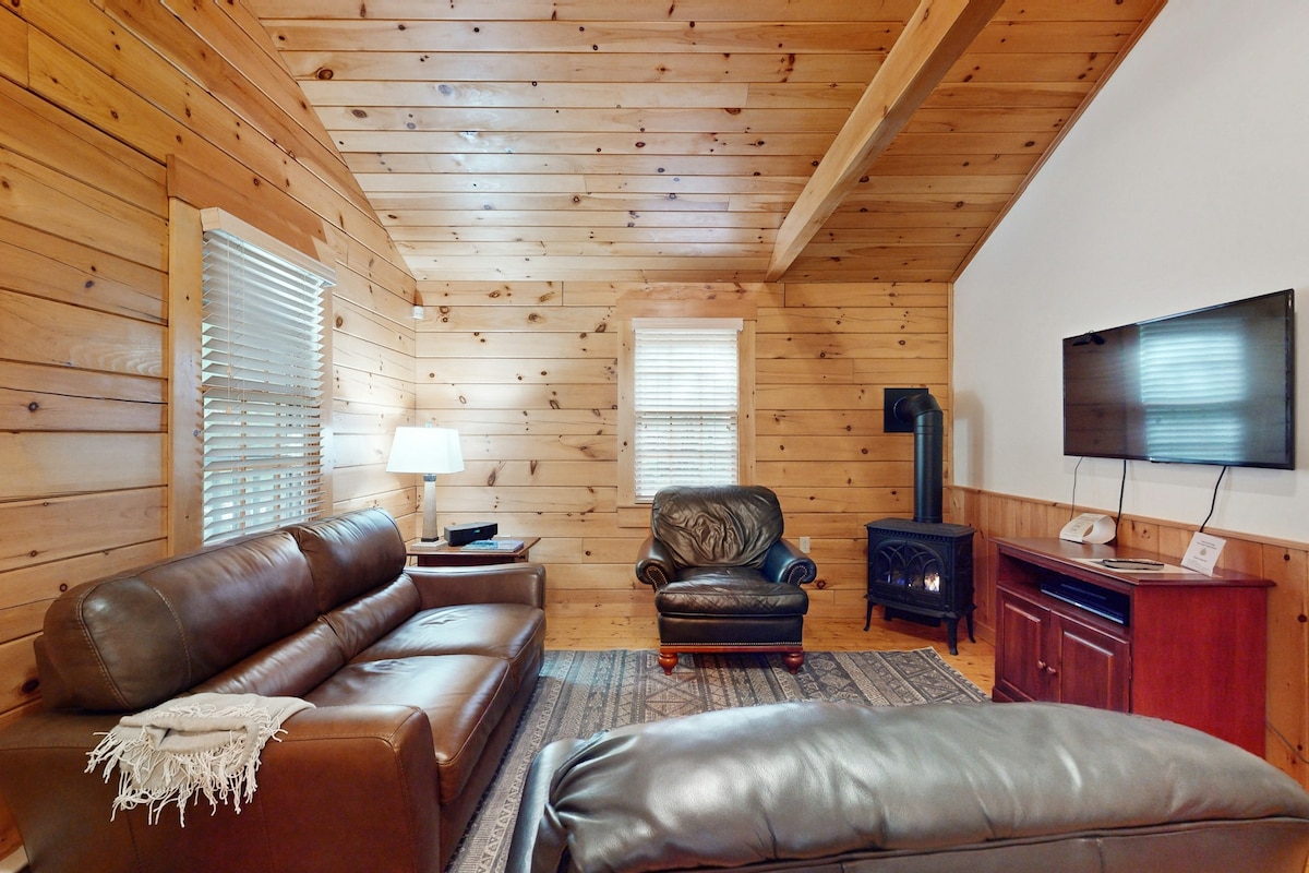 Acogedora cabaña de 2 dormitorios con chimenea, aire acondicionado y senderos