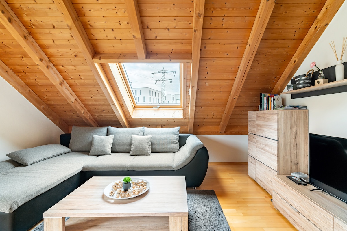 Nuestro luminoso apartamento ático de 3 habitaciones está situado en una zona rural, pero ofrece varias oportunidades de compra a 2-5 minutos a pie. La frontera suiza está a solo 5 minutos en coche del apartamento. El apartamento ofrece 2 dormitorios y una gran sala de estar, comedor y cocina. El apartamento tiene su propio balcón, así como una hermosa vista desde el tragaluz. Incluye aparcamiento gratuito, lavadora e internet rápido. Además, ofrecemos a nuestros huéspedes acceso gratuito a Netflix, Amazon Prime Video y Disney+.