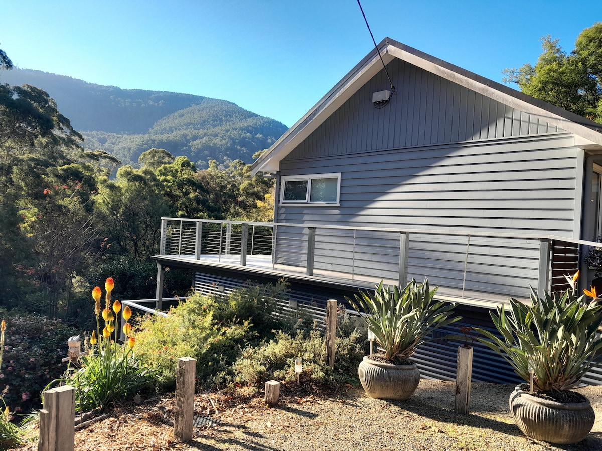 Private, peaceful one bedroom cottage a few minutes drive from Warburton Township, for your exclusive use. A sun dappled half acre block with gardens of European and Australian plants, mountain ash and tree ferns, and lovely mountain views. Amazing native birds and animals with very sociable parrots. Close to the Redwood Forest and Bodhivana Buddhist Temple. Rail Trail, Mountainbike Trail and O'Shannassy Aqueduct Trail nearby for walking and cycling. A genuine family owned and run holiday house.