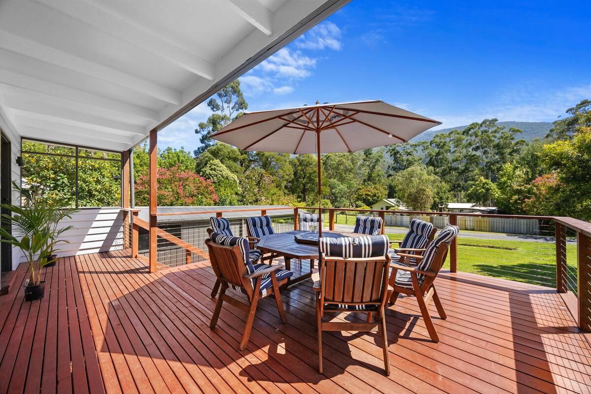 With breathtaking views overlooking Mount Victoria, this 1950s home has been lovingly restored and modernised into an open plan, bright space. Only a few minutes walk to the Main Street of Warburton, you can stroll into town or just sit on the large deck and listen to the many birds in the surrounding trees. An open kitchen with German appliances, a wood heater for cozy nights and a king bed for watching the many cloud formations that drift by makes this getaway so memorable.
