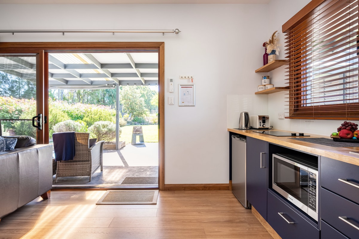 Relax in our private beautiful Japanese Studio , open plan bedroom and living room with seperate small bathroom. NOT suitable for children or pets. The Studio has a bar fridge , microwave, toaster, coffee pod machine and kettle. No kitchen. .Enjoy stunning 9 acres of gardens . Perfect location for photo shoots, wedding ceremonies or getaway. We also have 'The Dairy' which is a 1 bedroom cottage with a kitchen and fireplace. Strictly Non smoking. All guests to be COVID vaccinated. STRA 6648