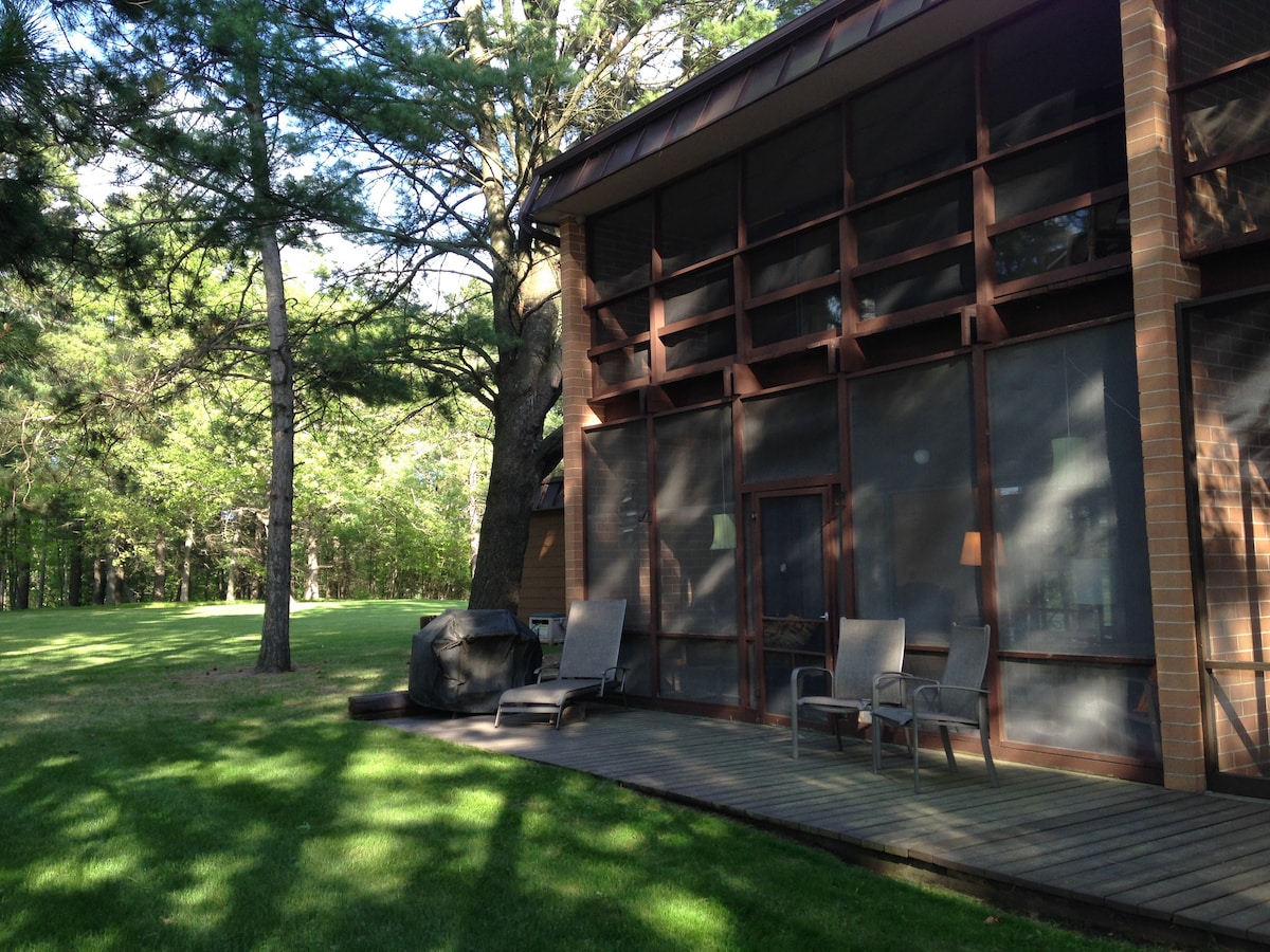 ¡Encuentra tu escapada de 2 acres en el bosque en Chain O'Lakes, cerca de la encantadora Waupaca! Este alojamiento de más de 3000 pies cuadrados tiene 5 dormitorios, 3,5 baños y cuenta con 10 camas (¡incluida una divertida cama de tienda de campaña!) + colchón de aire, jacuzzi, sauna, sala de juegos, espacios cuidados y un escritorio para trabajar desde casa. Disfruta de la barra de café/té/chocolate, asa en la terraza y asa s'mores en el fogón. Amplio y tranquilo para grupos grandes y familias. Disfruta de los senderos, paseos en bote, pesca y más. ¡Pregunta ahora por tu retiro de lujo y tu estancia inolvidable!