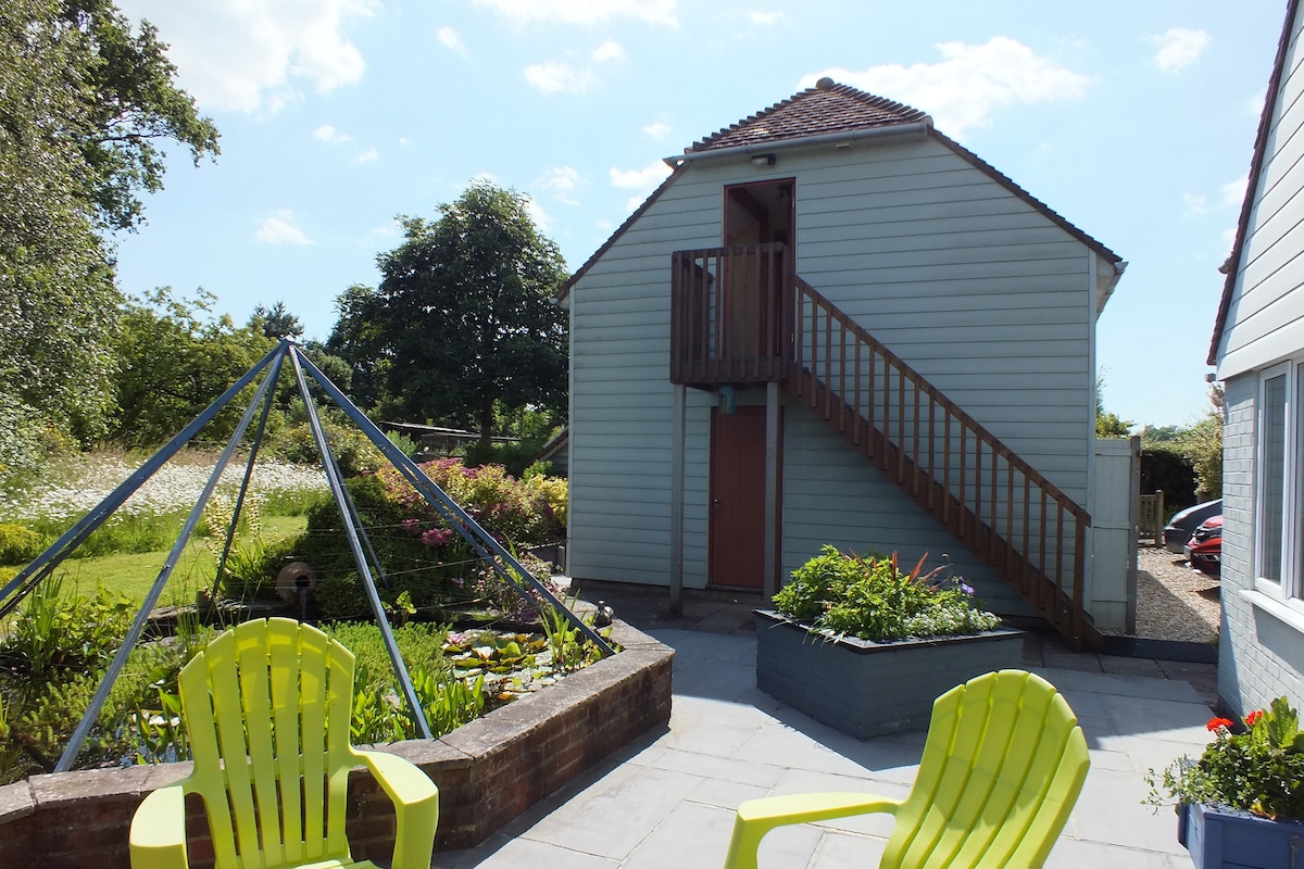 La propiedad es un anexo independiente de reciente construcción sobre el garaje, enclavado en los South Downs. Ofrece una amplia sala de estar de planta abierta adecuada para 2 huéspedes. Una pequeña sala de estar con sofá, silla y TV digital (incluye Amazon Prime), cajonera, espacio para colgar, espejo de cuerpo entero, etc. Wifi rápido. Cocina americana con mesa de comedor para comer/trabajar, microondas, hervidor de agua, tostadora y nevera. Té, café y azúcar de cortesía. El baño tiene ducha, lavabo e inodoro, con un gran espejo.
