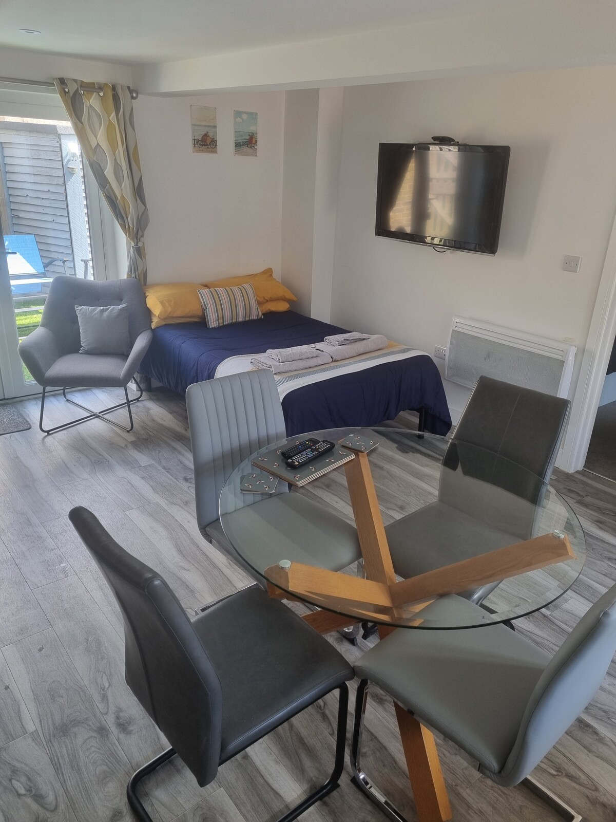 Estudio, dos camas individuales que se unen para hacer una tamaño king. Zona de desayuno con nevera, hervidor de agua, tostadora y microondas pequeño, TV y wifi, pequeña zona de jardín cerrada. Alojamiento ideal para visitar a familiares y amigos, trabajar o explorar la zona. Las camas individuales están disponibles para estancias de 3 noches o más. Por favor, avísame en el momento de la reserva si quieres dos camas individuales.
