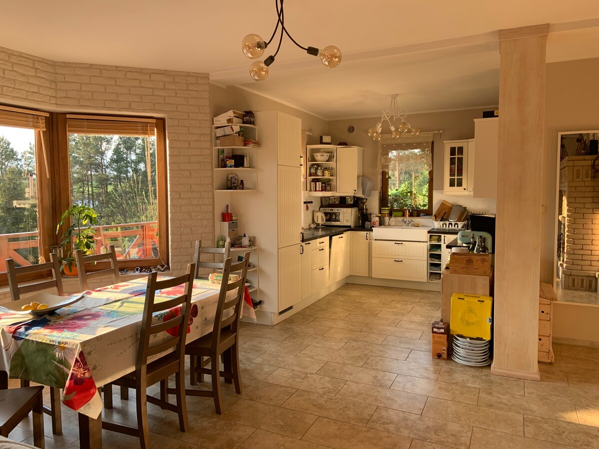 Alquilo una casa cómoda y confortable situada en una colina con una gran parcela forestal, rodeada de bosques y con una hermosa vista de los alrededores. Rodeado de naturaleza, puede relajarse y regenerarse. A su disposición, una gran parcela, un jardín con estanque, una parrilla de carbón, un gran patio adecuado para la actividad física con 3 plazas de aparcamiento. Todo está vallado y es seguro. La zona es rica en lagos y bosques, a unos 25 km de la Triciudad y de hermosas playas costeras.