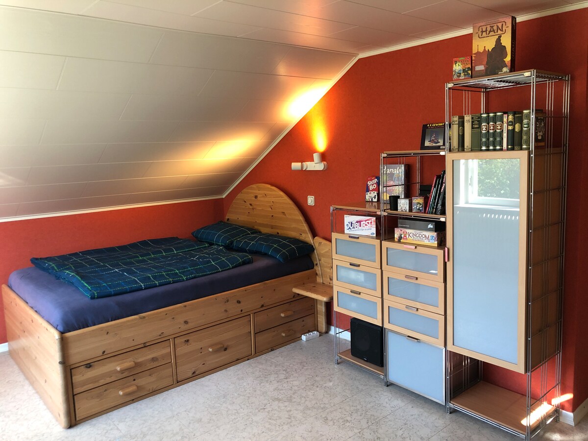 Mi alojamiento: una caseta de obra que antes era una caseta de jardín y que se colocó sobre una estructura móvil. El remolque de obra se ha equipado con un porche cubierto, se le ha dado un interior completamente nuevo y de buen gusto con iluminación, camas plegables, mesa retráctil, etc., y ahora se encuentra en un gran prado de ovejas, entre viejos árboles frutales, setos de hayas y grosellas, directamente en el dique del Elba. En la propiedad: una cocina industrial, una sauna con inodoro y ducha para el remolque.