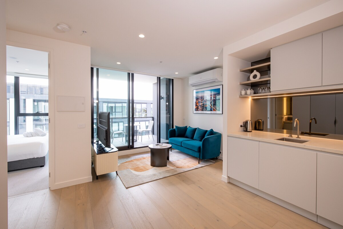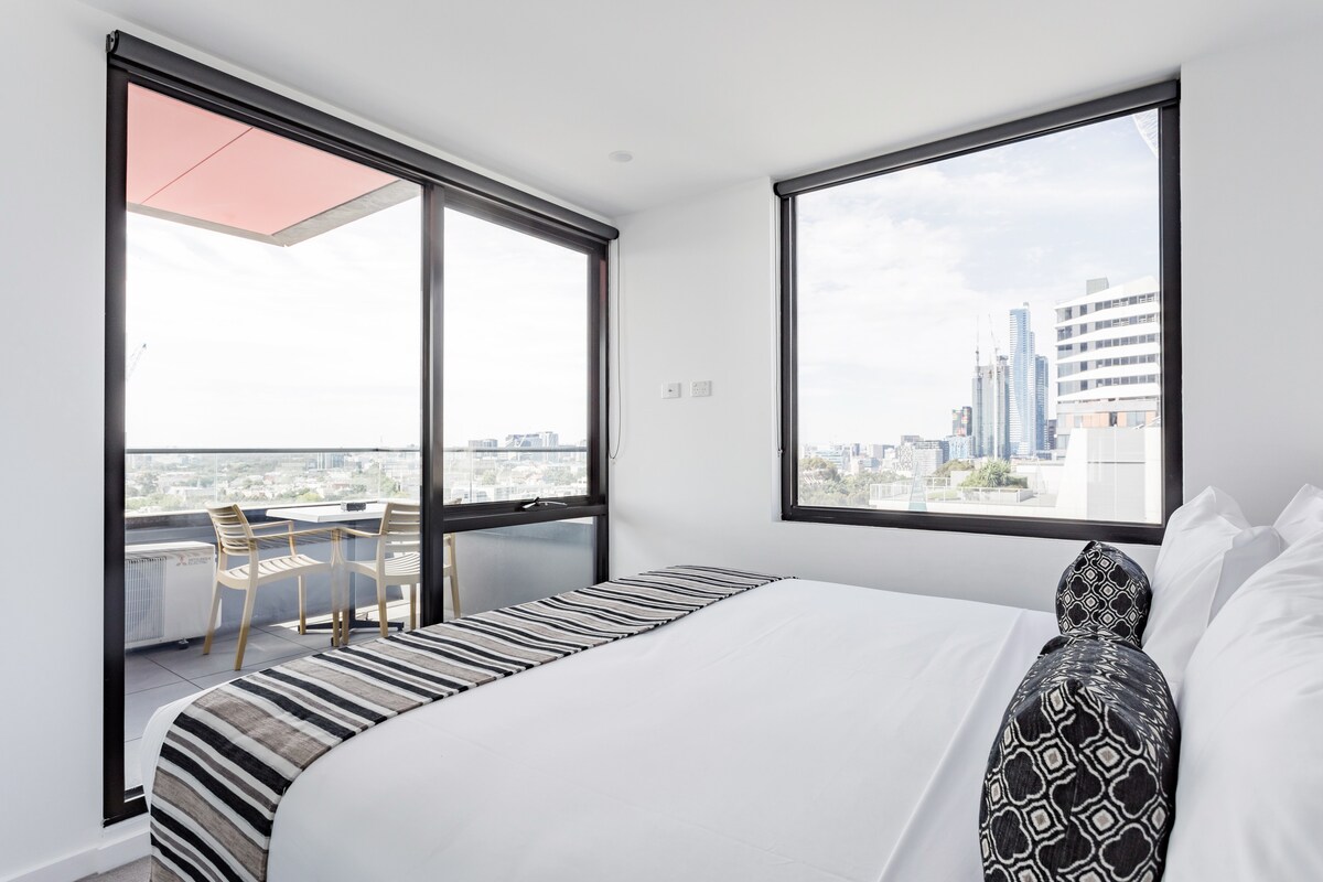 Ubicado en lo alto de la ciudad, este apartamento de hermoso estilo ofrece amplias vistas al horizonte, una lujosa cama tamaño queen, una cocina totalmente equipada, una máquina Nespresso para tu ritual matutino, wifi de alta velocidad, un balcón privado para relajarte y un pequeño regalo de bienvenida para que te sientas como en casa. A pocos pasos de restaurantes, Crown, Marvel Stadium y Southern Cross Station. SkyBus, trenes y tranvías están justo a tu puerta. Check-in anticipado o check-out tardío disponibles bajo petición: por favor, pregunte