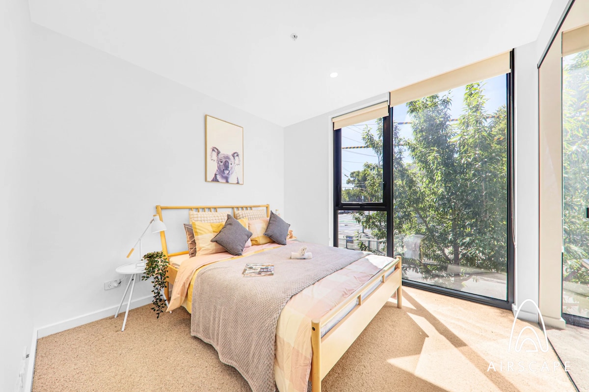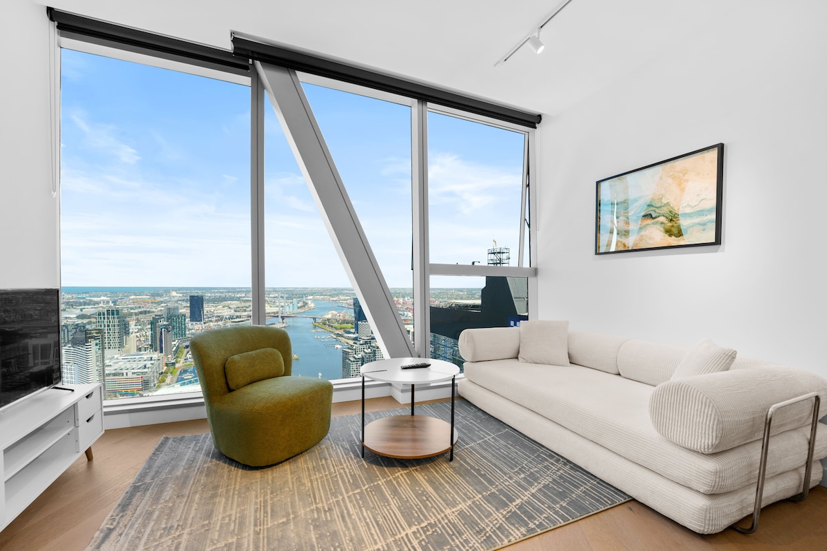 Un espacio tranquilo para llamar hogar mientras estás en Melbourne, tu propio apartamento de 2 dormitorios y 2 baños (64 metros cuadrados internos + balcón de 6 metros cuadrados). Diseñado pensando en un santuario simple, moderno y minimalista. Disfruta de las increíbles vistas del perfil urbano. Este es un espacio de ambiente familiar. Ubicado junto a la estación de Southern Cross y la terminal de autobuses Sky Bus. Situado en la zona de tranvía gratuito, todo lo que Melbourne tiene para ofrecer está a tu alcance, cerca de comida barata, restaurantes elegantes y cafeterías de moda.