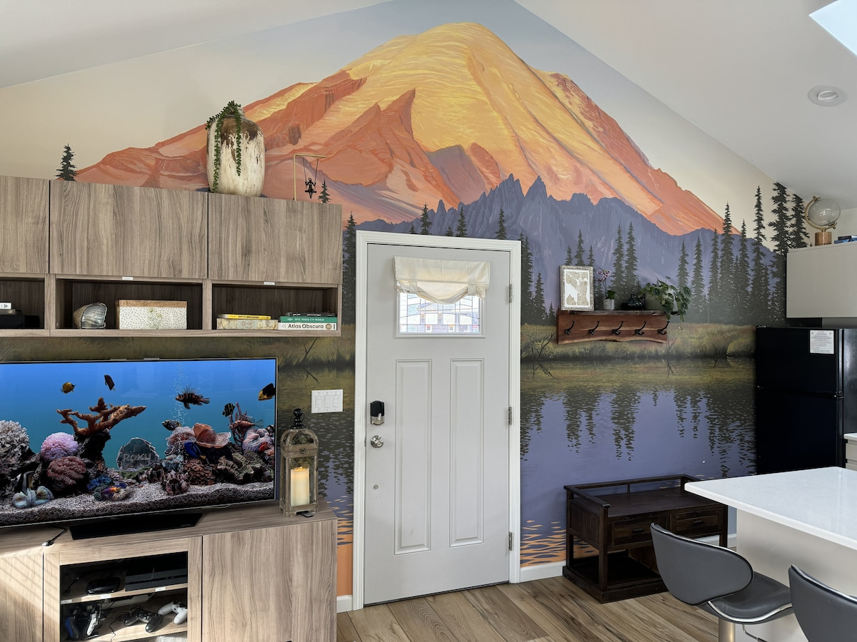 Convenientemente ubicado a 5 minutos del estadio T-Mobile Park y Lumen Field. Copa del Mundo, Serie Mundial. Ubicación en el oeste de Seattle, en el barrio de North Admiral, con increíbles vistas del horizonte de Seattle, una suite privada de un dormitorio con chimenea y cama supletoria y vistas increíbles de la ciudad, una lujosa ducha de hidromasaje, a 11 minutos de Pike Place, a 2 minutos a pie del icónico parque mirador de Seattle, cafetera Kuerig y espresso, cocina moderna completa, microondas, nevera, ropa de cama prémium y cama tamaño king de espuma viscoelástica, Direct TV,